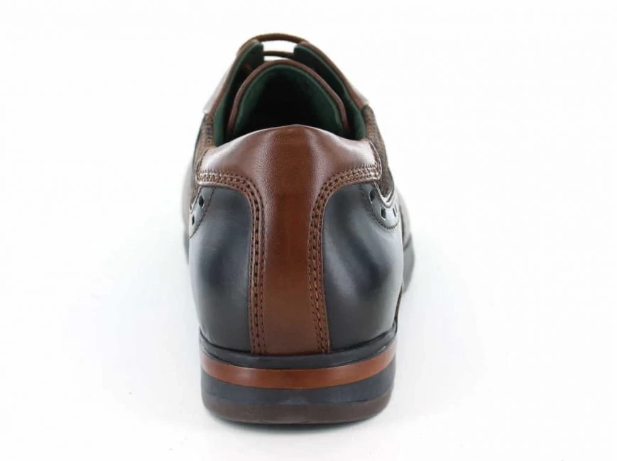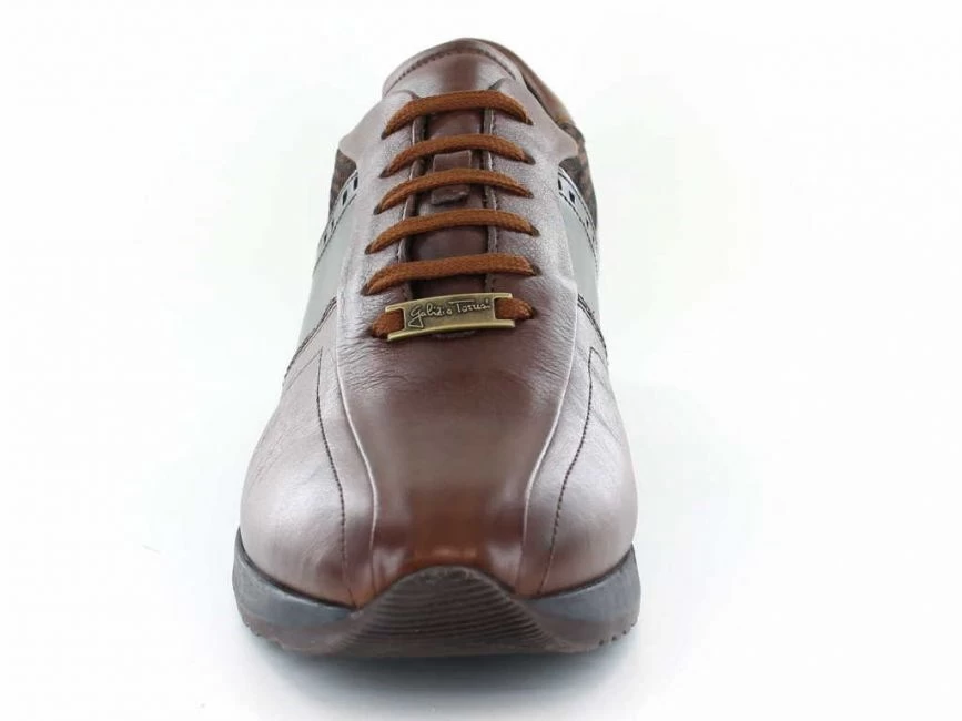 Modisch ist dieser Schnürschuh aus dem italienischen Hause Galizio Torresi. Der Farbmix aus dunkelblauem und braunem Kalbsleder ist perfekt gelungen. Die Schnürung ist sportlich und macht auch eine individuelle Weiteneinstellung möglich. Die kunstvollen Nähte auf der Vorderseite des Schuhes runden das Design ab.
