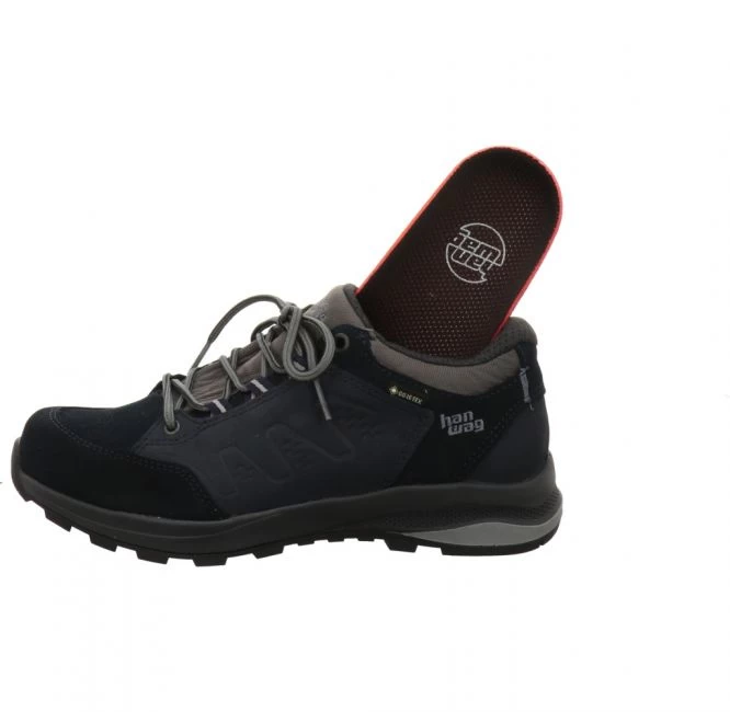 Bequemer Low Cut von Hanwag. Das Obermaterial besteht aus hochwertigem Velours- und Nubukleder sowie Textil an Schaft und Zunge. Das Innenfutter ist mit einer atmungsaktiven, wind- und wasserdichten GORE-TEX® Membran ausgestattet. Dank Straight Fit haben Sie mehr Platz und Komfort im Vorfußbereich und einen guten Sitz am Mittelfuß. Mit der griffigen Hanwag Endurance Hike Sohle haben Sie besten Halt auf verschiedensten Untergründen. Die PU-Zwischensohle und der verstärkte PU-Schaumkeil bieten beste Dämpfung. Die Innensohle ist austauschbar. Für Ihren persönlichen Gehkomfort können Sie Ihre eigenen Einlagen einsetzen. Dieses Modell ist der perfekter Partner für einfache Wanderungen, leichte Mittelgebirgstouren und Spaziergänge in die Natur. Sportlich, modisch und komplett in Europa gefertigt.