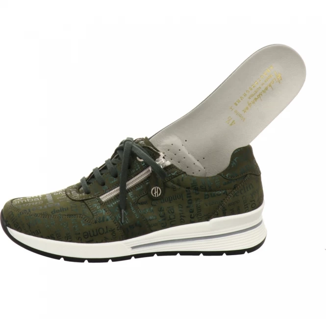 Bequemer Sneaker aus dem Hause Hickersberger in Weite H. Das Obermaterial besteht aus hochwertigem Leder. Für das Innenfutter wurde ein Mix aus Stretch Textil im Vorfußbereich und Leder verwendet. Dadurch ist er besonders geeignet bei Hallux. Für einen schnellen Ein- und Ausstieg sorgt der seitlich angebrachte Reißverschluss zusätzlich zur Schnürung. Das austauschbare Fußbett ist mit Leder überzogen und verfügt über eine Kräutereinlage. Diese wird durch die Fußwärme aktiviert und gibt seine angenehme Wirkung an die Füße ab. Für Ihren persönlichen Gehkomfort können Sie Ihre eigenen orthopädischen Einlagen verwenden. Die rutschhemmende Laufsohle in Konstrastfarben sorgt jederzeit für sicheren Halt. Besonderer Blickfang ist der schimmernde Druck mit den verschiedensten Städten der Welt. Ein bequemer und gemütlicher Schuh für jeden Tag!