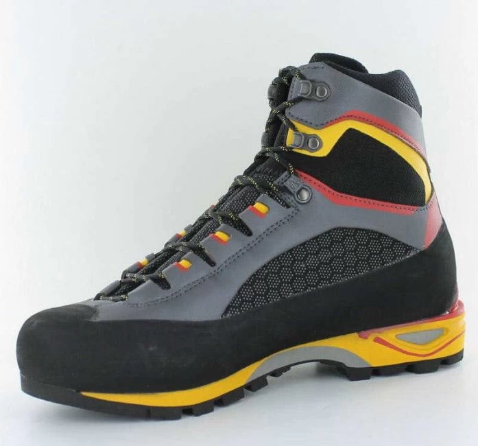 Technisches Nylon mit Mikrofasereinsätzen aufgeschweißt, GORE-TEX-Klimafutter, 7 mm Nylonbrandsohle, durch EVA gedämpfte Vibram-Profilsohle. Leichter, moderner Bergschuh, konzipiert für alpin Wanderungen, Klettersteig und Touren mit schwerem Gepäck.
