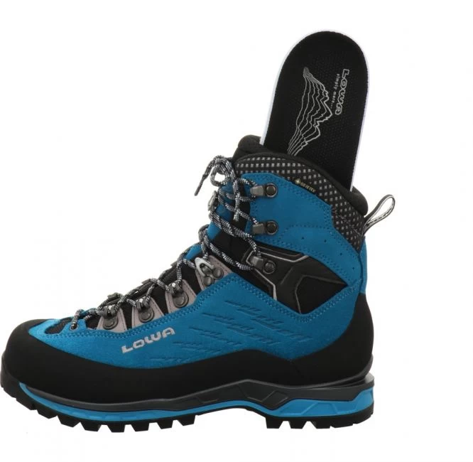Alpiner Alleskönner aus dem Hause LOWA. Für eine optimale Passform wurde für dieses Modell ein speziell der weiblichen Anatomie angepasster Leisten verwendet. Das Obermaterial besteht aus einem hochwertigen Mix aus 90 Prozent Veloursleder und 10 Prozent Textil. Das Innenfutter ist mit einer atmungsaktiven, wind- und wasserdichten GORE-TEX® Membran ausgestattet. Die austauschbare Innensohle besteht aus viskoelastischem Latexschaum. Durch Körperwärme und Druck passt sie sich exakt an Ihren Fuß an. Für Ihren persönlichen Gehkomfort können Sie Ihre eigenen Einlagen einsetzen. Ösen mit einem Kugellager sorgen für einen besonders leichten Lauf der Schnürung. Die Zunge wird mit x-lacing® sowohl vertikal als auch horizontal fixiert. Die Vibram® Laufsohle sorgt jederzeit für besten Halt. Spezielle Klemmhaken unterteilen die Schnürung in zwei Zonen und können so unabhängig voneinander fixiert werden. Für noch mehr Komfort vefügt dieses Modell über LOWA-Flex, FLEXFIT SYNCRO und FLEXFIT. Beste Passform und optimaler Gehkomfort für leichte Hochtouren, alpine Klettereien bis hin zu anspruchsvollen Klettersteigen. Der Lowa Cevedale ist geeignet für halbautomatische Steigeisen mit Fersenbügel.
