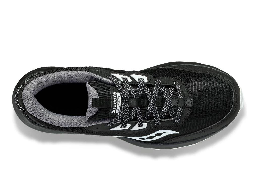 Der SAUCONY Aura TR ist ein robuster Trailschuh, der mit seinen Eigenschaften abseits befestigter Wege punktet. Mit einer angepassten Dämpfung, einem griffigen Außensohlenprofil und einem zweilagigen Obermaterial bringt er alles an den Start, um im Gelände unterwegs zu sein. Aber auch bei leichten Wanderungen, beim Walken und bei der Runde mit dem Hund überzeugt der SAUCONY Aura TR.